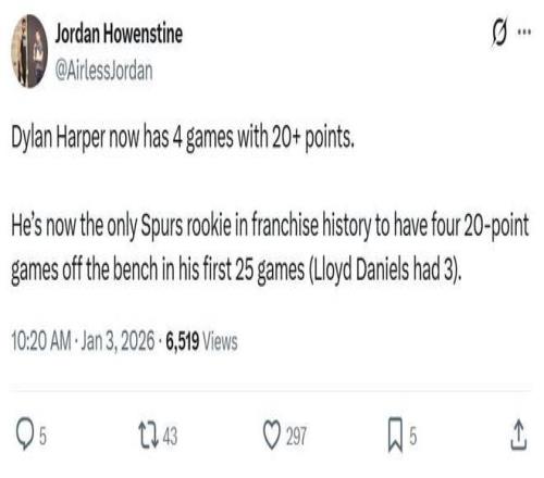 在生涯前25场比赛中替补拿下4次20+得分表现,也让哈珀超越罗伊德-丹尼尔斯创造马刺新的队史纪录。