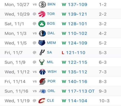 回顾火箭的13场比赛,火箭0胜2负开局后,迎来5连胜,连续击败篮网、猛龙、凯尔特人、独行侠和灰熊,输给马刺后,他们又打出5连胜,接连战胜雄鹿、奇才、开拓者、魔术和骑士。目前,火箭10胜3负,排在西部第三。