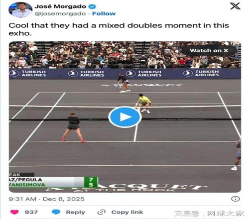 四位职业选手在上周日晚间联手上演了一场混双表演赛。卡洛斯与佩古拉搭档,而蒂亚福则与阿尼西莫娃组队。这是这位西班牙人第二次参加混双比赛,上一次是他和拉杜卡努在美网混双中输给佩古拉与德雷珀。这一次,阿尔卡拉斯全情投入,与新的搭档配合得十分开心。