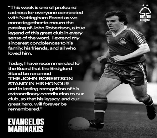 。为纪念俱乐部传奇,森林老板马里纳基斯提议用罗伯逊名字命名看台。