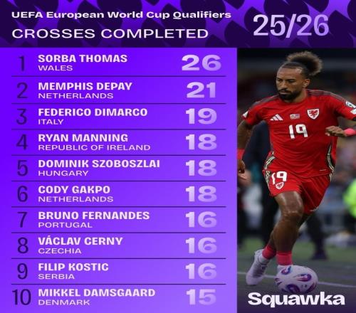 11月20日宣 本届欧洲杯预选赛小组赛战幕已经落下帷幕,数据统计网站squakwa对各球员的表现进行了全面回顾,特别是在传中方面表现出色的球员名单中,威尔士的边锋索尔巴·托马斯以26次成功传中荣登榜首,展现了他在场上的无畏和努力。